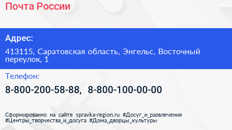 Почта России по адресу 413115, Саратовская область, Энгельс, Восточный переулок, 1 в дальнейшем Организация, размещена в следующих категориях: