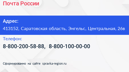 Почта России по адресу 413152, Саратовская область, Энгельс, Центральная, 26в в дальнейшем Организация, размещена в следующих категориях: