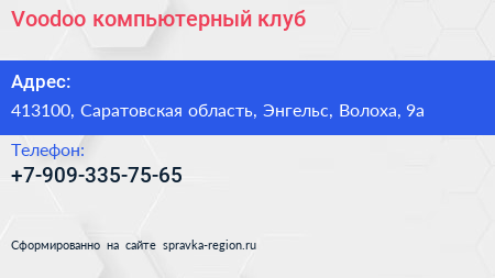 Voodoo, компьютерный клуб по адресу 413100, Саратовская область, Энгельс, Волоха, 9а в дальнейшем Организация, размещена в следующих категориях: