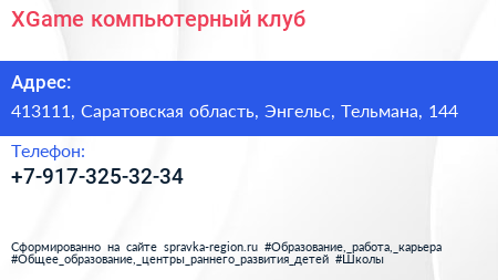 XGame, компьютерный клуб по адресу 413111, Саратовская область, Энгельс, Тельмана, 144 в дальнейшем Организация, размещена в следующих категориях: