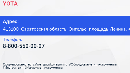 YOTA по адресу 413100, Саратовская область, Энгельс, площадь Ленина, 4 в дальнейшем Организация, размещена в следующих категориях: