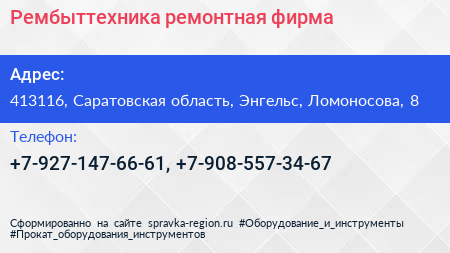 Рембыттехника, ремонтная фирма по адресу 413116, Саратовская область, Энгельс, Ломоносова, 8 в дальнейшем Организация, размещена в следующих категориях: