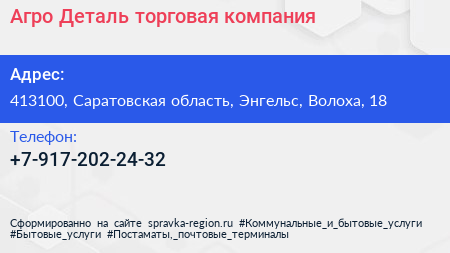 Агро-Деталь, торговая компания по адресу 413100, Саратовская область, Энгельс, Волоха, 18 в дальнейшем Организация, размещена в следующих категориях: