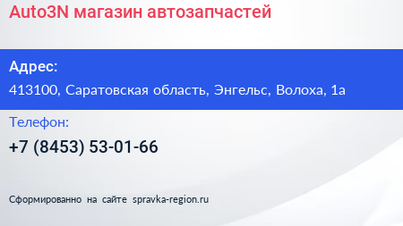 Auto3N, магазин автозапчастей по адресу 413100, Саратовская область, Энгельс, Волоха, 1а в дальнейшем Организация, размещена в следующих категориях: