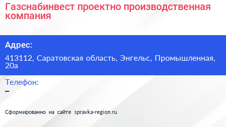 Газснабинвест, проектно-производственная компания по адресу 413112, Саратовская область, Энгельс, Промышленная, 20а в дальнейшем Организация, размещена в следующих категориях: