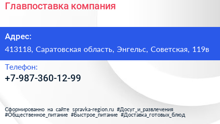 Главпоставка, компания по адресу 413118, Саратовская область, Энгельс, Советская, 119в в дальнейшем Организация, размещена в следующих категориях:
