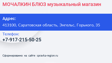 МОЧАЛКИН БЛЮЗ, музыкальный магазин по адресу 413100, Саратовская область, Энгельс, Горького, 35 в дальнейшем Организация, размещена в следующих категориях: