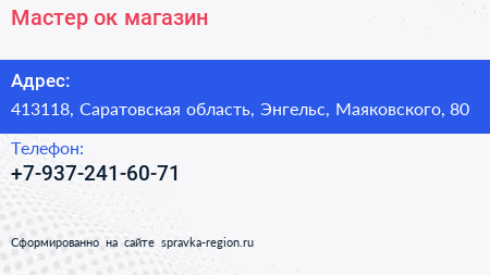 Мастер`ок, магазин по адресу 413118, Саратовская область, Энгельс, Маяковского, 80 в дальнейшем Организация, размещена в следующих категориях: