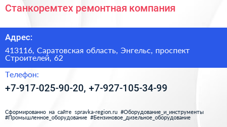Станкоремтех, ремонтная компания по адресу 413116, Саратовская область, Энгельс, проспект Строителей, 62 в дальнейшем Организация, размещена в следующих категориях: