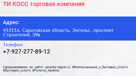 ТИ КОСС, торговая компания по адресу 413116, Саратовская область, Энгельс, проспект Строителей, 39в в дальнейшем Организация, размещена в следующих категориях: