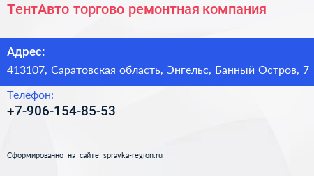 ТентАвто, торгово-ремонтная компания по адресу 413107, Саратовская область, Энгельс, Банный Остров, 7 в дальнейшем Организация, размещена в следующих категориях: