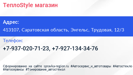 ТеплоStyle, магазин по адресу 413107, Саратовская область, Энгельс, Трудовая, 12/3 в дальнейшем Организация, размещена в следующих категориях: