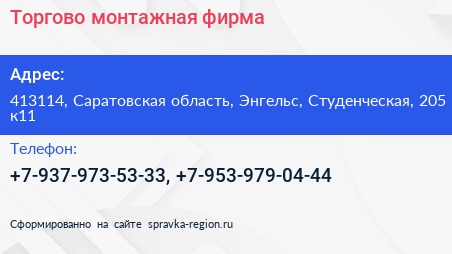 Торгово-монтажная фирма по адресу 413114, Саратовская область, Энгельс, Студенческая, 205 к11 в дальнейшем Организация, размещена в следующих категориях: