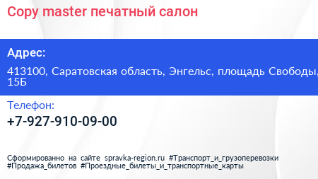 Copy master, печатный салон по адресу 413100, Саратовская область, Энгельс, площадь Свободы, 15Б в дальнейшем Организация, размещена в следующих категориях: