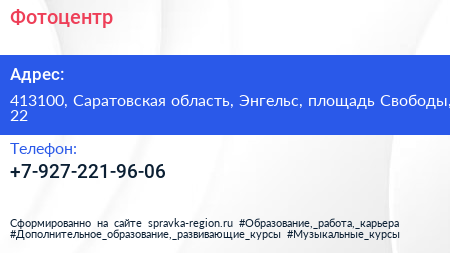 Фотоцентр по адресу 413100, Саратовская область, Энгельс, площадь Свободы, 22 в дальнейшем Организация, размещена в следующих категориях: