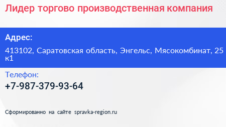 Лидер, торгово-производственная компания по адресу 413102, Саратовская область, Энгельс, Мясокомбинат, 25 к1 в дальнейшем Организация, размещена в следующих категориях: