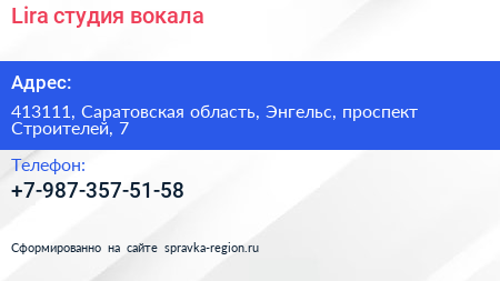 Lira, студия вокала по адресу 413111, Саратовская область, Энгельс, проспект Строителей, 7 в дальнейшем Организация, размещена в следующих категориях: