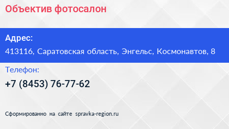 Объектив, фотосалон по адресу 413116, Саратовская область, Энгельс, Космонавтов, 8 в дальнейшем Организация, размещена в следующих категориях: