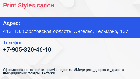Print Styles, салон по адресу 413113, Саратовская область, Энгельс, Тельмана, 137 в дальнейшем Организация, размещена в следующих категориях: