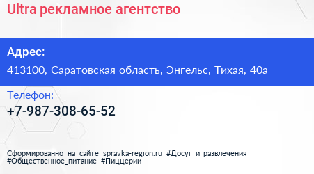 Ultra, рекламное агентство по адресу 413100, Саратовская область, Энгельс, Тихая, 40а в дальнейшем Организация, размещена в следующих категориях: