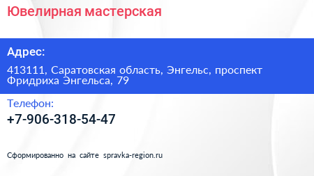 Ювелирная мастерская по адресу 413111, Саратовская область, Энгельс, проспект Фридриха Энгельса, 79 в дальнейшем Организация, размещена в следующих категориях: