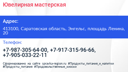 Ювелирная мастерская по адресу 413100, Саратовская область, Энгельс, площадь Ленина, 20 в дальнейшем Организация, размещена в следующих категориях:
