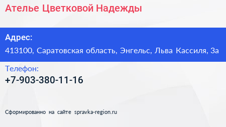 Ателье Цветковой Надежды по адресу 413100, Саратовская область, Энгельс, Льва Кассиля, 3а в дальнейшем Организация, размещена в следующих категориях: