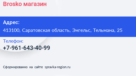 Brosko, магазин по адресу 413100, Саратовская область, Энгельс, Тельмана, 25 в дальнейшем Организация, размещена в следующих категориях: