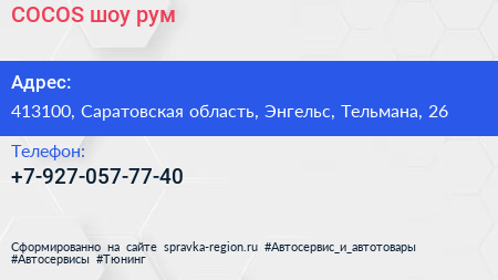 COCOS, шоу-рум по адресу 413100, Саратовская область, Энгельс, Тельмана, 26 в дальнейшем Организация, размещена в следующих категориях: