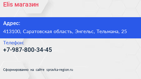 Elis, магазин по адресу 413100, Саратовская область, Энгельс, Тельмана, 25 в дальнейшем Организация, размещена в следующих категориях: