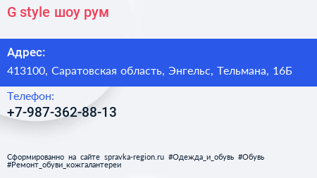 G style, шоу-рум по адресу 413100, Саратовская область, Энгельс, Тельмана, 16Б в дальнейшем Организация, размещена в следующих категориях: