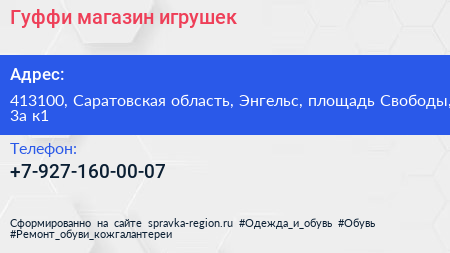 Гуффи, магазин игрушек по адресу 413100, Саратовская область, Энгельс, площадь Свободы, 3а к1 в дальнейшем Организация, размещена в следующих категориях: