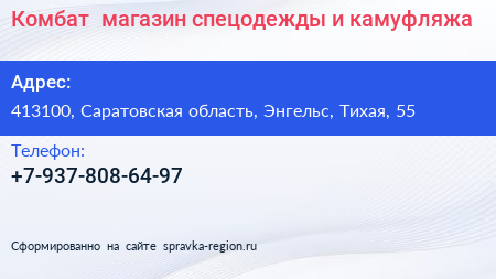 Комбат+, магазин спецодежды и камуфляжа по адресу 413100, Саратовская область, Энгельс, Тихая, 55 в дальнейшем Организация, размещена в следующих категориях: