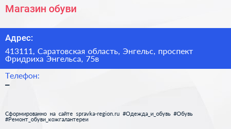 Магазин обуви по адресу 413111, Саратовская область, Энгельс, проспект Фридриха Энгельса, 75в в дальнейшем Организация, размещена в следующих категориях: