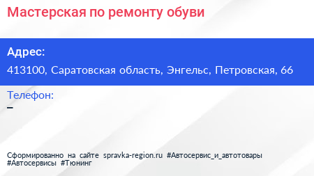 Мастерская по ремонту обуви по адресу 413100, Саратовская область, Энгельс, Петровская, 66 в дальнейшем Организация, размещена в следующих категориях: