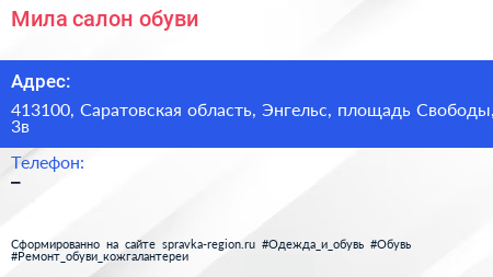 Мила, салон обуви по адресу 413100, Саратовская область, Энгельс, площадь Свободы, 3в в дальнейшем Организация, размещена в следующих категориях: