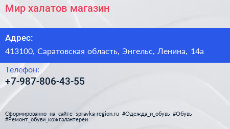 Мир халатов, магазин по адресу 413100, Саратовская область, Энгельс, Ленина, 14а в дальнейшем Организация, размещена в следующих категориях: