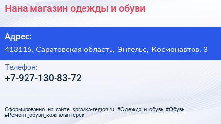 Нана, магазин одежды и обуви по адресу 413116, Саратовская область, Энгельс, Космонавтов, 3 в дальнейшем Организация, размещена в следующих категориях: