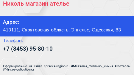 Николь, магазин-ателье по адресу 413111, Саратовская область, Энгельс, Одесская, 83 в дальнейшем Организация, размещена в следующих категориях: