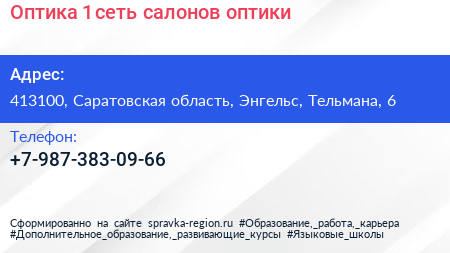 Оптика №1, сеть салонов оптики по адресу 413100, Саратовская область, Энгельс, Тельмана, 6 в дальнейшем Организация, размещена в следующих категориях: