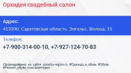 Орхидея, свадебный салон по адресу 413100, Саратовская область, Энгельс, Волоха, 15 в дальнейшем Организация, размещена в следующих категориях: