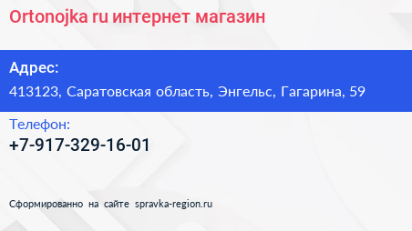 Ortonojka.ru, интернет-магазин по адресу 413123, Саратовская область, Энгельс, Гагарина, 59 в дальнейшем Организация, размещена в следующих категориях:
