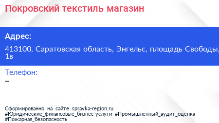 Покровский текстиль, магазин по адресу 413100, Саратовская область, Энгельс, площадь Свободы, 1в в дальнейшем Организация, размещена в следующих категориях: