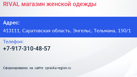RIVAL, магазин женской одежды по адресу 413111, Саратовская область, Энгельс, Тельмана, 150/1 в дальнейшем Организация, размещена в следующих категориях: