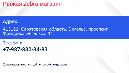 Рыжая Zebra, магазин по адресу 413111, Саратовская область, Энгельс, проспект Фридриха Энгельса, 11 в дальнейшем Организация, размещена в следующих категориях: