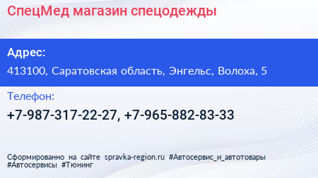 СпецМед, магазин спецодежды по адресу 413100, Саратовская область, Энгельс, Волоха, 5 в дальнейшем Организация, размещена в следующих категориях: