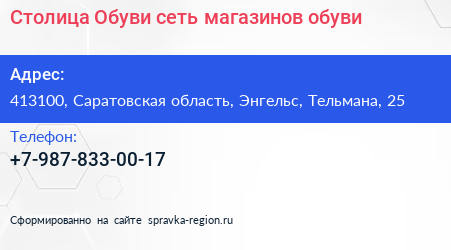 Столица Обуви, сеть магазинов обуви по адресу 413100, Саратовская область, Энгельс, Тельмана, 25 в дальнейшем Организация, размещена в следующих категориях: