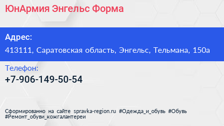 ЮнАрмия Энгельс Форма по адресу 413111, Саратовская область, Энгельс, Тельмана, 150а в дальнейшем Организация, размещена в следующих категориях: