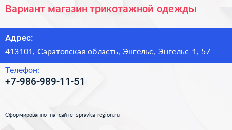 Вариант, магазин трикотажной одежды по адресу 413101, Саратовская область, Энгельс, Энгельс-1, 57 в дальнейшем Организация, размещена в следующих категориях: