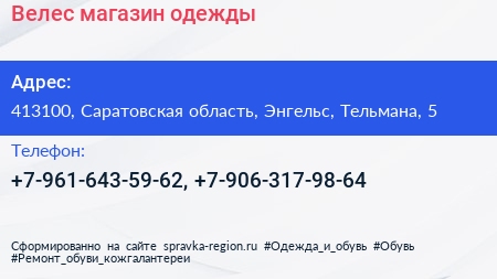 Велес, магазин одежды по адресу 413100, Саратовская область, Энгельс, Тельмана, 5 в дальнейшем Организация, размещена в следующих категориях: